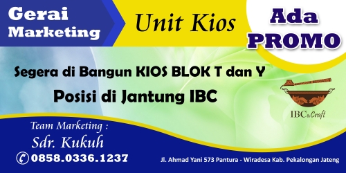 Promo Kios IBC Blok T dan Y 25 February 2017 Promo Sewa Kios Blok T dan Y Posisi di Jantung IBC. Pemesanan Hubungi : Team Marketing KUKUH ( 0858.0336.1237 ) atau datang langsung ke Office IBC : Jl. Ahmad Yani 573 Wiradesa Pekalongan Buruan sebelum kehabisan....!!!! |